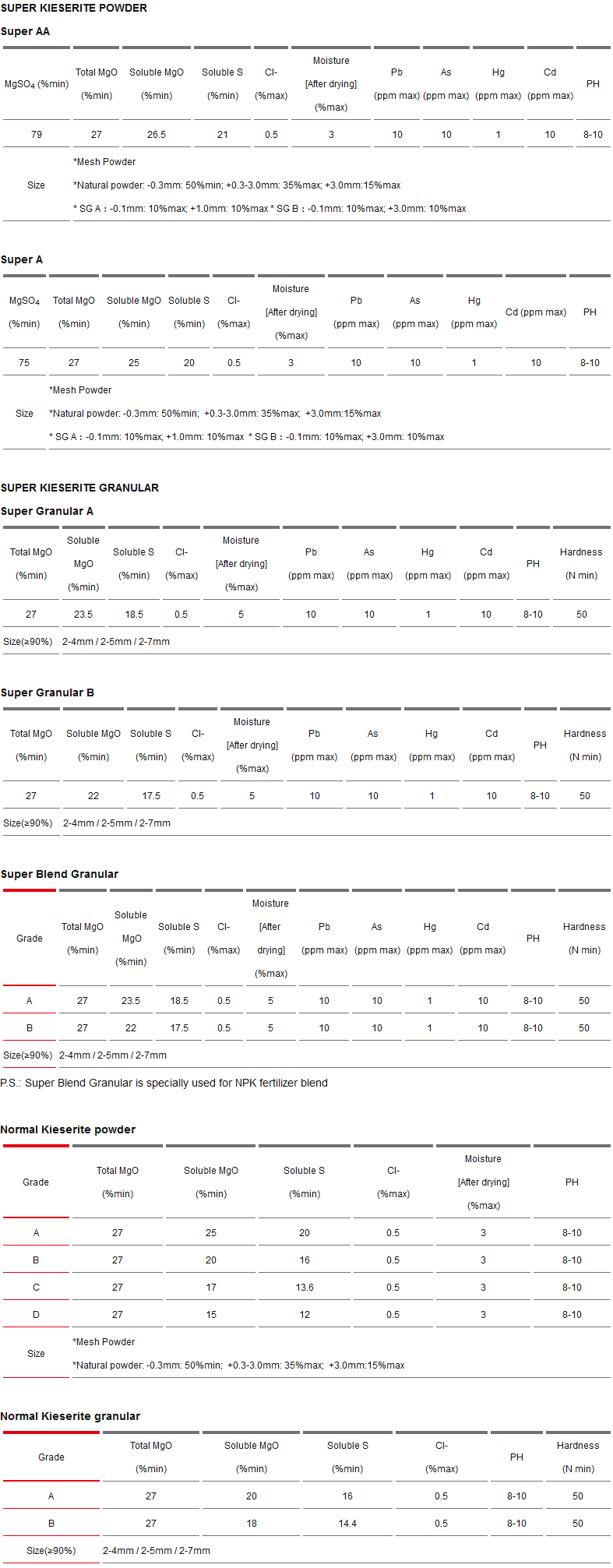 Features of granular products: low content of chloride, heavy metals and free acid, free of chemical organic matter, high water solubility, no caking, free from dust, good hardness and weak alkaline.